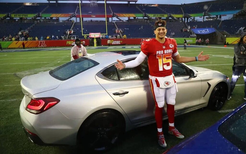 Élu Meilleur joueur du Pro Bowl en 2019 (MVP), Mahomes a été récompensé avec une Genesis G70. Cette berline compacte de luxe constitue l’alternative sud-coréenne à la BMW Série 3. Elle est motorisée par un V6 biturbo, dont la puissance atteint 368 chevaux, et propose une liste d’équipements plutôt garnie. Pour mémoire, Genesis est la division luxueuse du groupe Hyundai/Kia.